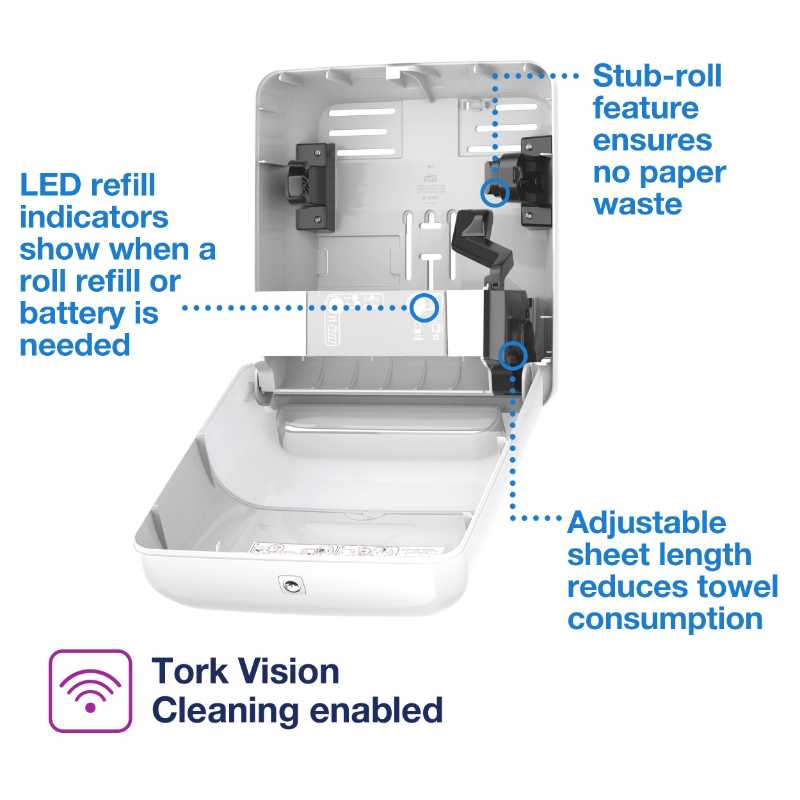 - Simplify maintenance – this easy-to-clean, dual locking design has a refill indicator and is Tork Vision Cleaning compatible.
