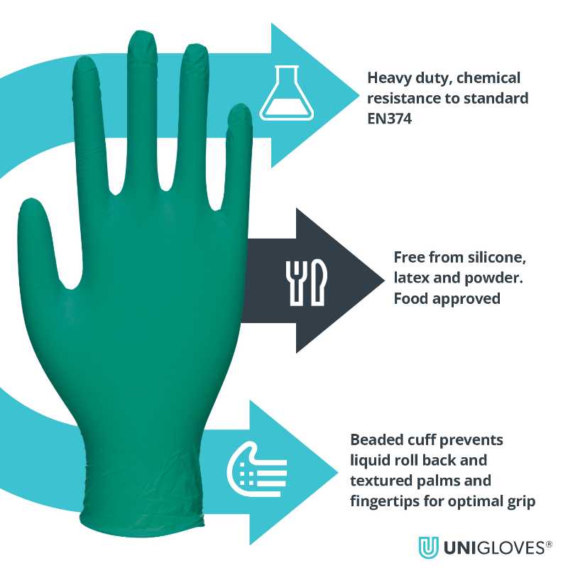 - Unique nitrile formulation conforms to the hand during use for a more comfortable fit