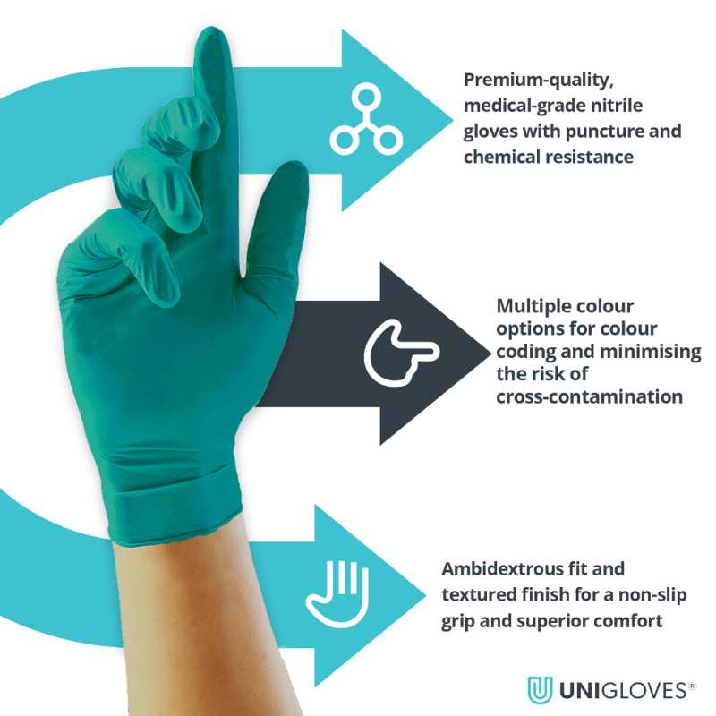 Available in 16 colours and featuring medical grade, food safe, latex free construction, Unigloves Pearl range of disposable nitrile gloves offers the ultimate in comfort, safety, and durability for various applications. Tested to EN374 and meeting medical standards for pinholes, our Pearl range of disposable nitrile gloves is not only resistant to chemicals and safe for use in medical applications, but are also safe for use in the food industry.
