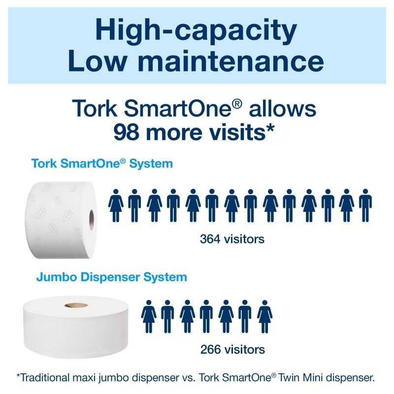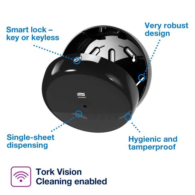 The Tork SmartOne Mini Toilet Roll Dispenser in Elevation Design is an efficient and very robust dispensing system suitable for demanding washrooms with low to medium traffic. The sheet-by-sheet dispensing helps to reduce consumption by up to 40% when compared to traditional jumbo roll dispensers, which means more visits per roll.